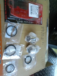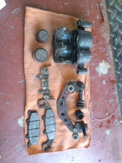 オーバーホールしたブレーキキャリパーと内蔵の部品を並べてみました。