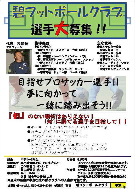 碧フットボールクラブ新規入会選手 募集中!
